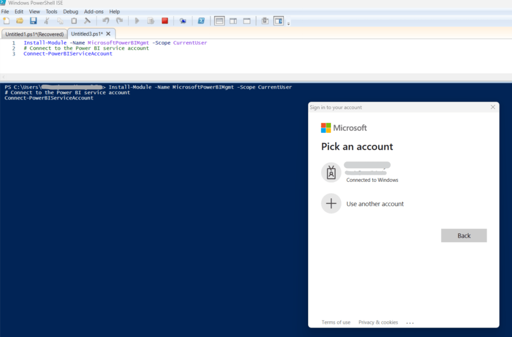 Next, let’s connect to our Power BI Service account. For that purpose we use this script: