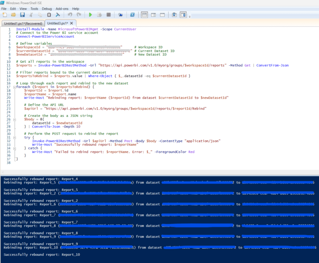 Write-Host “Failed to rebind report: $reportName. Error: $_” -ForegroundColor Red