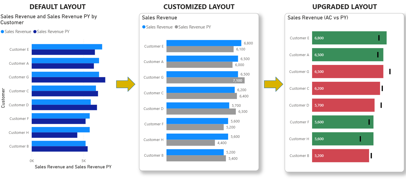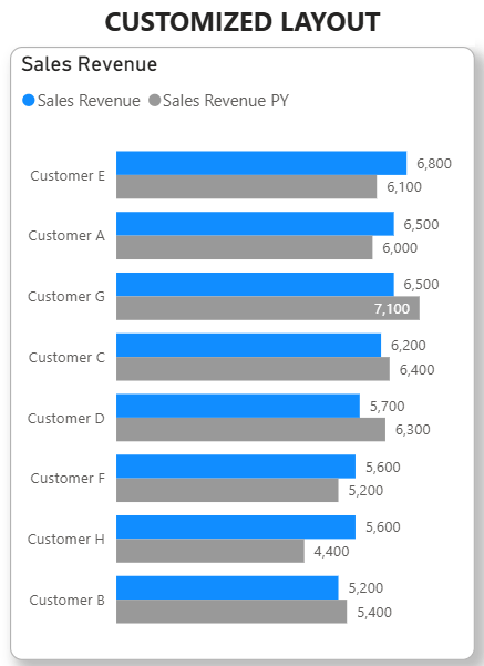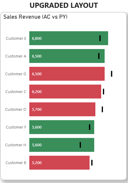 - layout with markers – instead of having a lot of bars (AC and PY per each customer) we can show only one bar (AC) and to show PY as marker