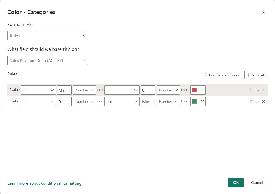 - Create new metric: Sales Revenue delta = Sales Revenue – Sales Revenue PY