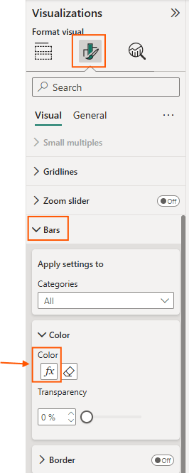 - Select the visual, go to formatting > bars > color. Here click on Fx.